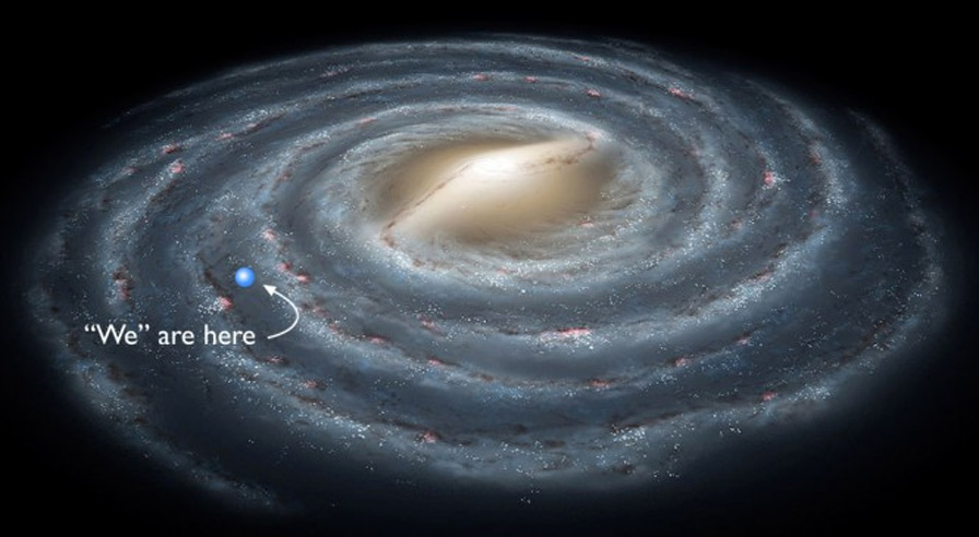From Earth the Milky Way appears as a band because its disk-shaped structure is viewed from within. Help with the next section: a light year is the distance that light can travel in one year: 9.46 trillion kilometres (5.88 trillion miles). And a trillion is: 1,000,000,000,000 - 1 followed by 12 zeros. A billion is 1,000,000,000 - 1 followed by 9 zeros. The Milky Way is a barred spiral galaxy that has a diameter usually considered to be roughly 100,000 to 120,000 light-years but may be 150,000 to 180,000 light-years. The Milky Way is estimated to contain 100 to 400 billion stars, although this number may be as high as one trillion. There are probably at least 100 billion planets in the Milky Way. The Solar System is located within the disk, about 27,000 light-years from the Galactic Center, on the inner edge of one of the spiral-shaped concentrations of gas and dust called the Orion Arm.