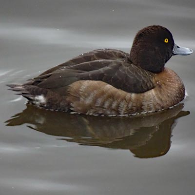 The tufted duck is very distinctive: the female is entirely chocolate-brown, while the male is black with white flanks and a long tuft at the back of the head.