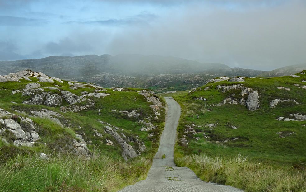 | Malcolm MacLeod (normally known as Calum) built the road almost single-handedly from here to its terminus at Arnish, a distance of almost 2.5km, over a period of ten years in an effort to save his community. |